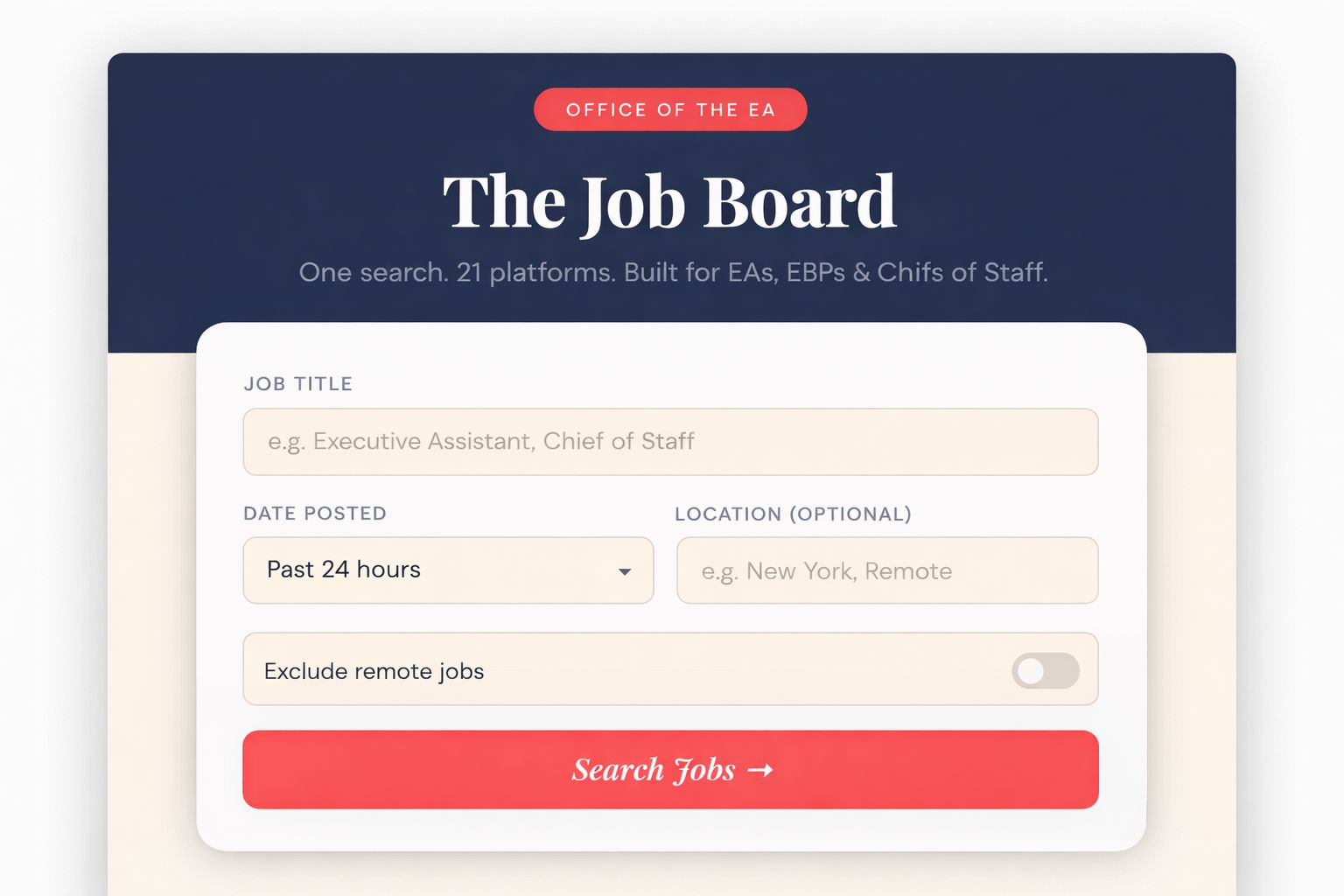 Search across 25+ job boards for Executive Assistant, Chief of Staff, and operator roles, all in one place.